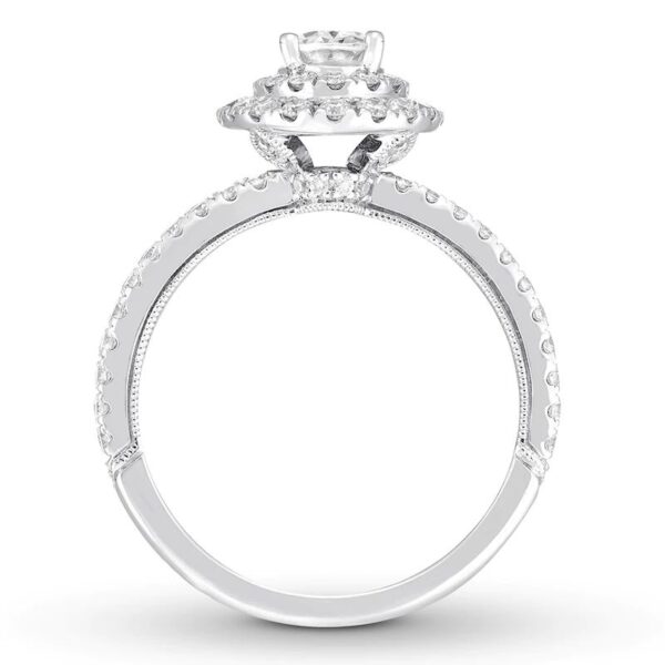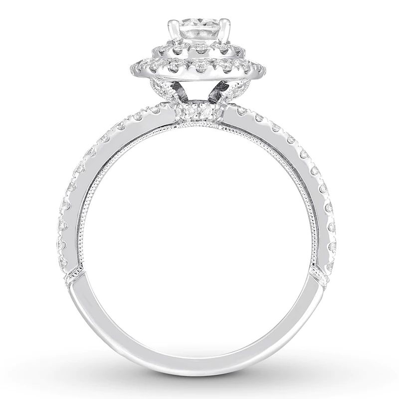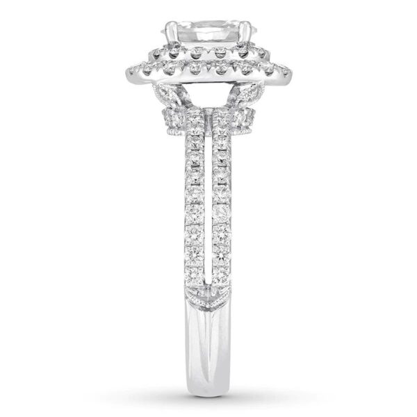 Engagement ring embraces the modern beauty of the halo design. The brilliant 1-carat oval-shaped diamond center reflects passion for vintage designs, while round diamonds add sparkle to the split-shank band. The diamonds total 1 3/4 carats in weight.